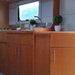 • בקראוון מטבחון מרווח הכולל כיריים + כיור, ארונות אחסון בחלק תחתון ועליון עם דלתות הכוללות בולמים.